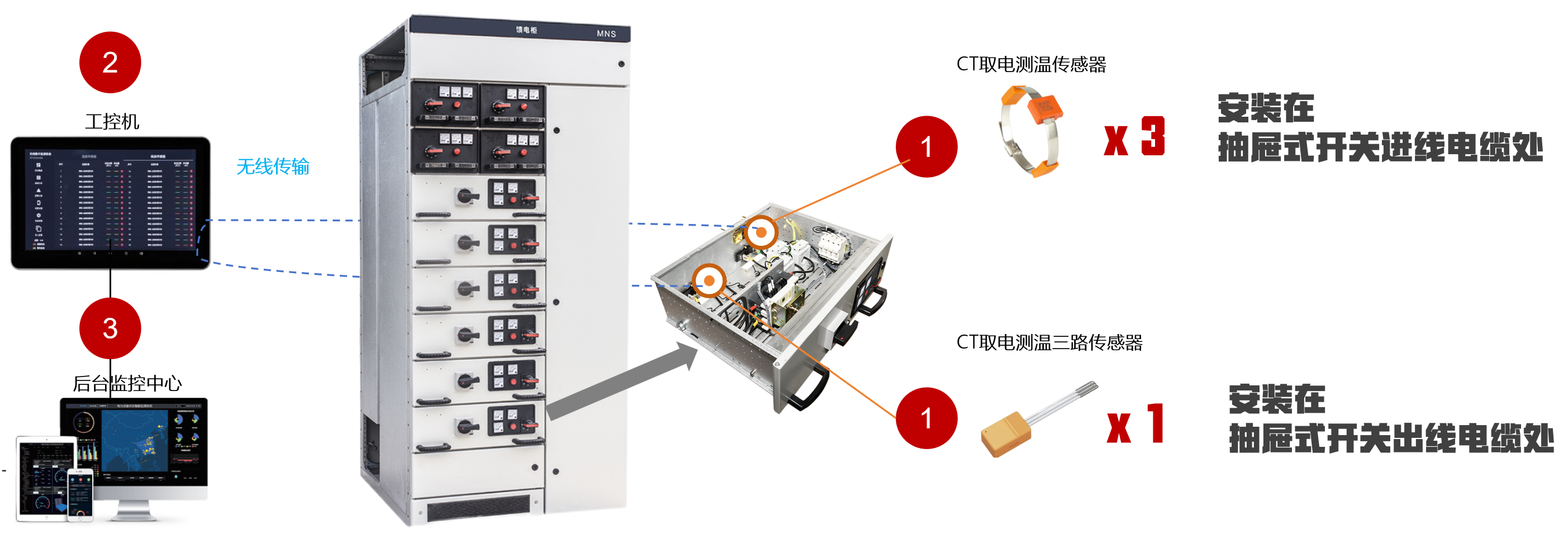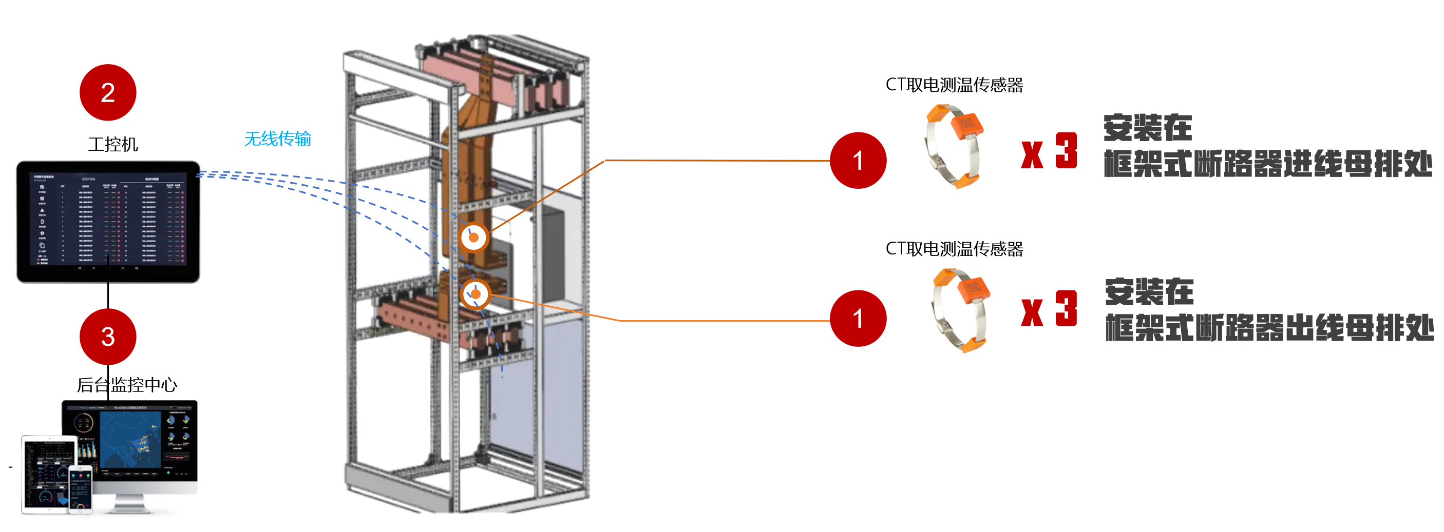 系统由CT取电无线无源测温传感器、CT取电无线无源3路测温传感器、工控机和后台监控中心组成。