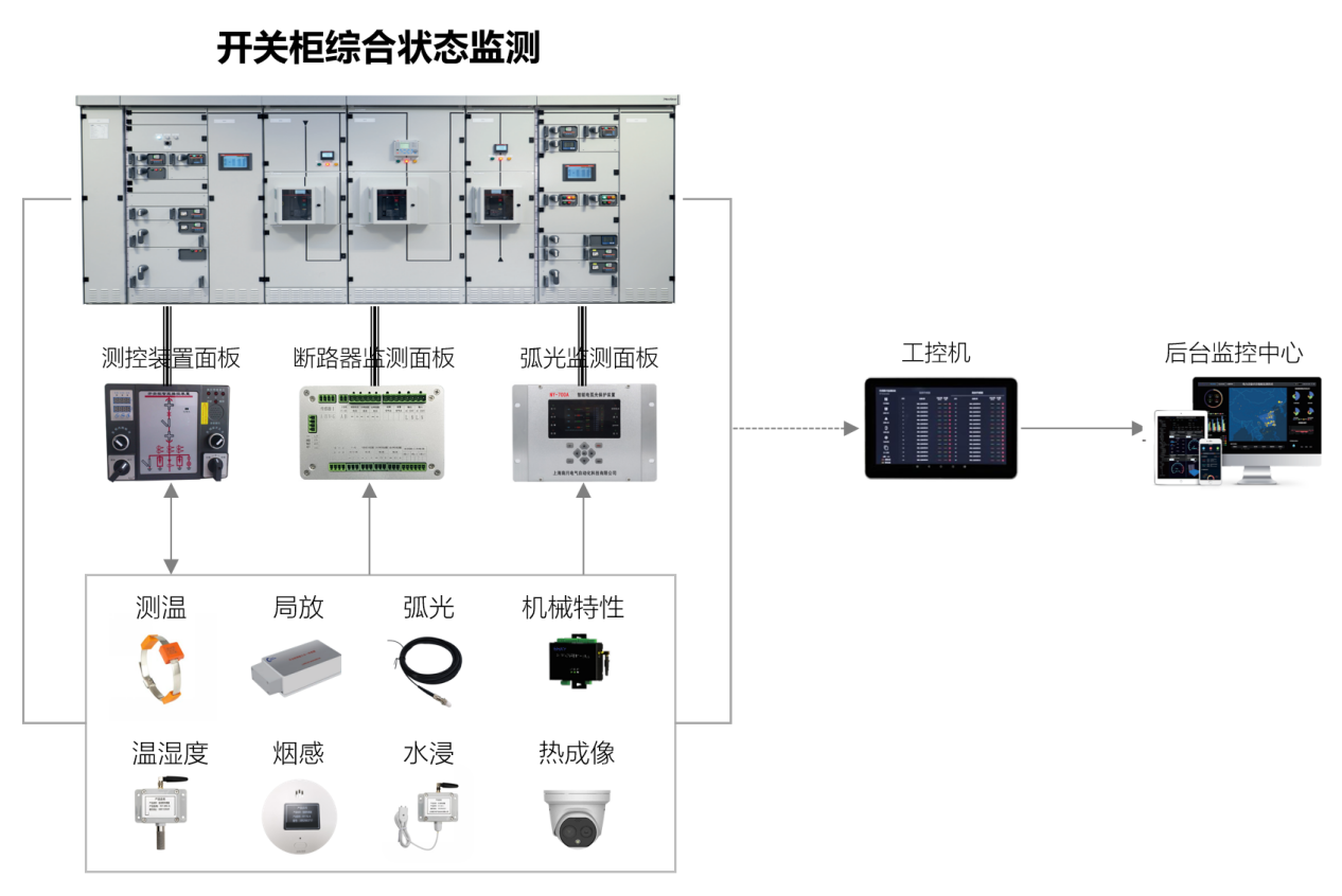 华君开关柜综合状态监测解决方案,该系统围绕开关柜展开,设有测控装置面板、断路器监测面板和弧光监测面板。系统通过局放传感器、温湿度传感器、烟感设备等多元监测设备,分别针对开关柜的局部放电、温湿度等状态参数进行实时采集。各监测设备采集的数据会传输至对应面板,经初步处理后,数据被传送至工控机,再由工控机将数据传输至后台监控中心,以此达成对开关柜综合状态的全面监测与高效管理。该系统可助力相关人员及时察觉开关柜潜在故障隐患,对保障电力设备安全稳定运行意义重大。整体架构组成如下: