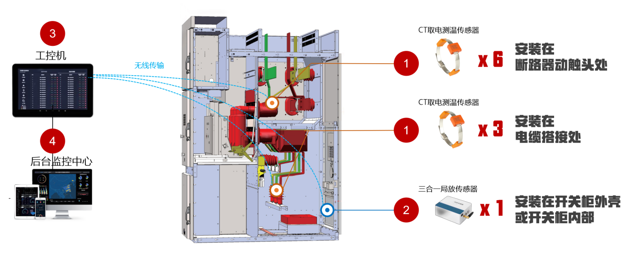 ①温度传感器典型部署:在每个开关柜内部三相进线母排安装3个CT取电无线无源测温传感器,在三相出线线缆安装1个CT取电无线无源3路测温传感器;